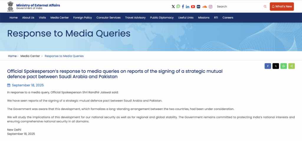 सऊदी अरब और पाकिस्तान के आपसी रक्षा समझौते पर भारत का आधिकारिक बयान